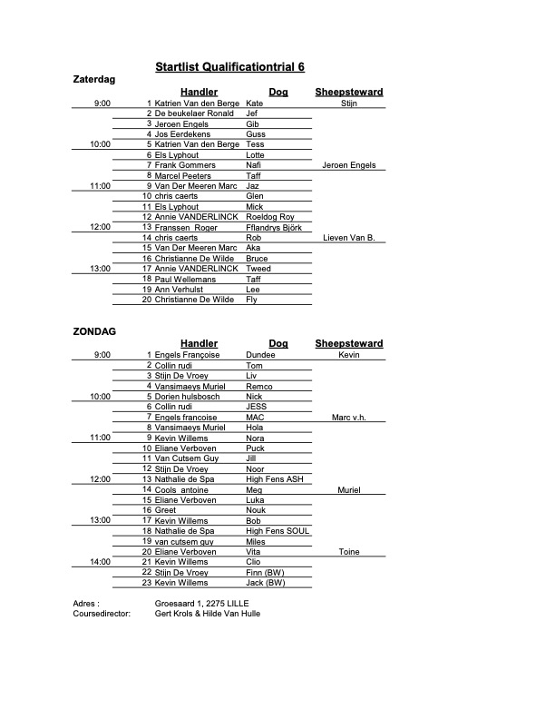 Startlijsten voor kwalificatiewedstrijd 6 georganiseerd door de Belgian Border Collie Club te Poederlee. We wensen iedereen veel succes, mooie runs en vooral heel veel plezier.